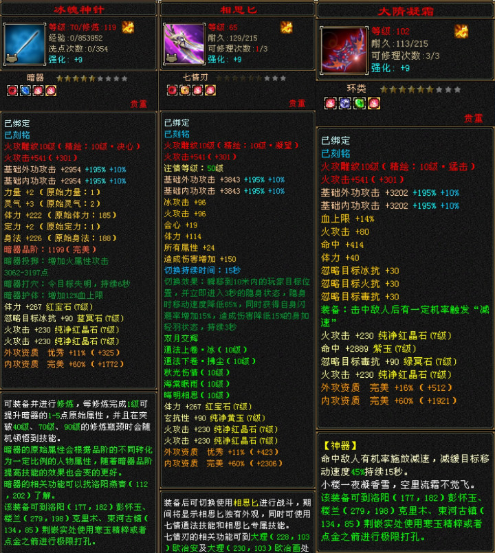 戒指护符全套冰火毒三属性156+极品,除了第一个戒指带个内功有点鸡肋以外,其他都是完美属性。